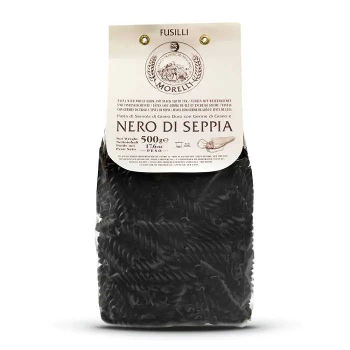 Nero Fusilli 500 g ist eine besondere Spiralpasta aus Hartweizengrieß, Weizenkeimen und natürlicher Tintenfischtinte. Dadurch erhält sie ihre charakteristische schwarze Farbe und ein leicht maritimes Aroma.